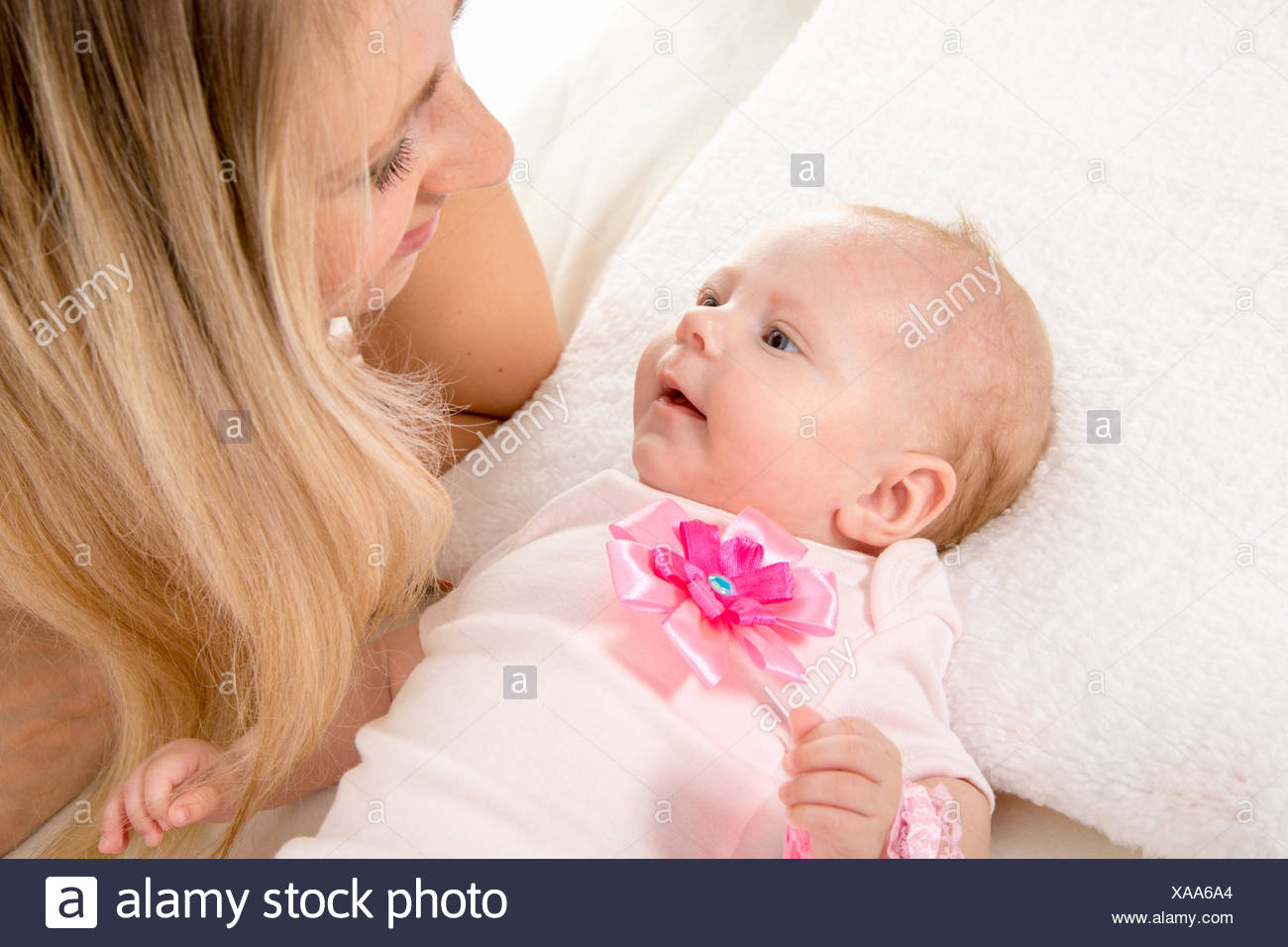 Mom and two-month baby looking at each baby looking at mom
