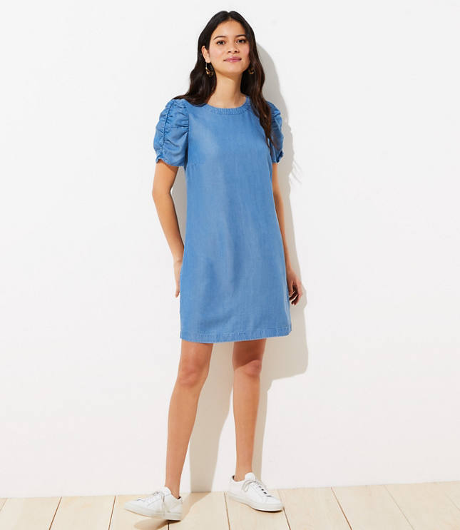 Chambray Ruched Sleeve Shift Dress casual chambray dress