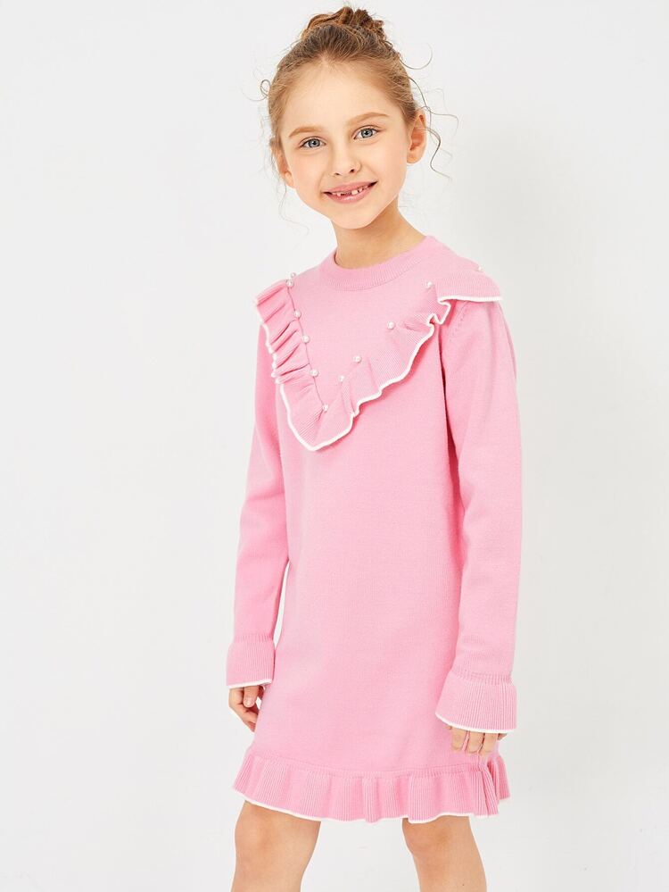 Toddler Girls Pearl Beaded Frill Trim pink pearl sweater dress