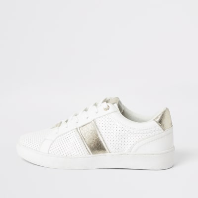 White perforated gold stripe lace-up white shoes with gold stripes