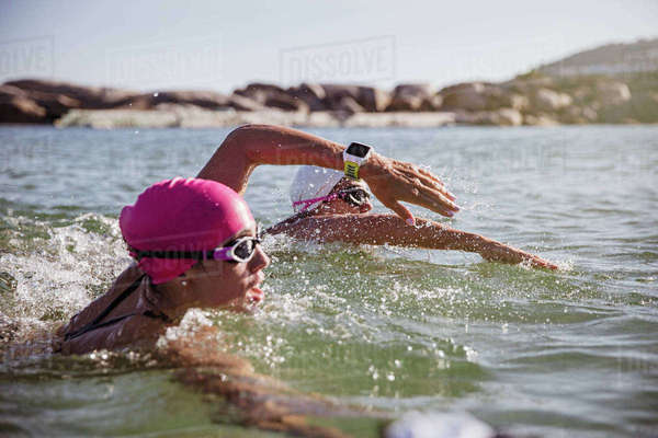 Determined female open water swimmer smartwatch for open water swimming