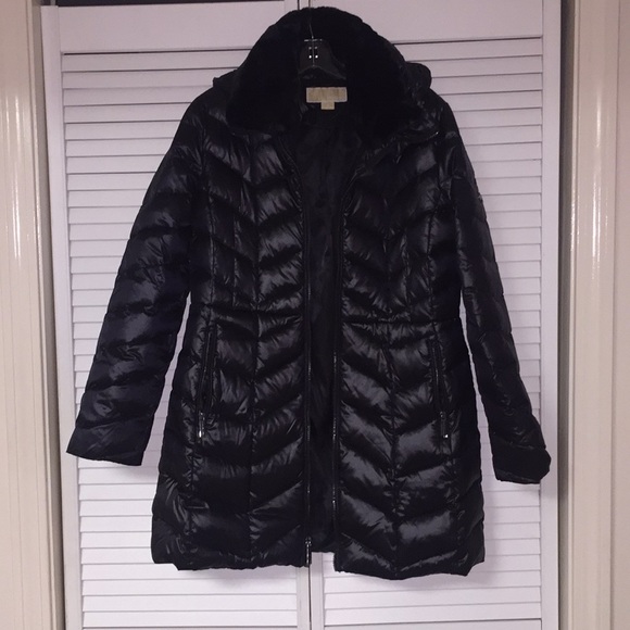 Shiny Knee Length Puffer Coat With Fur michael kors shiny puffer