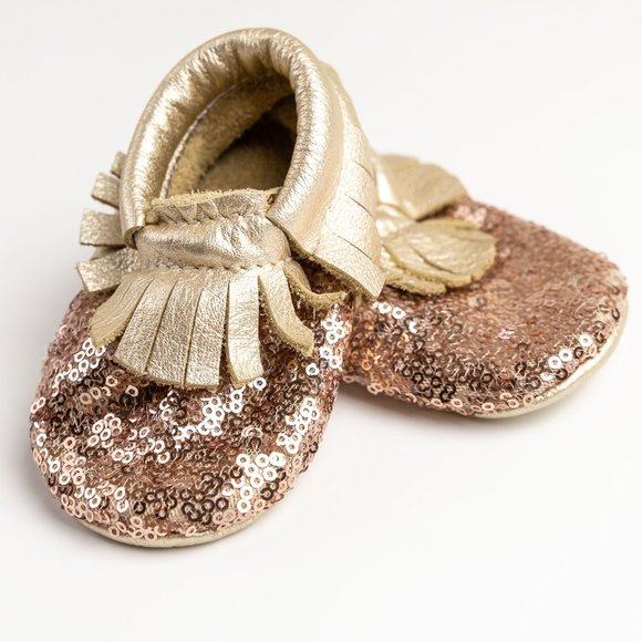 Rose Gold Sequin And Gold Leather Baby rose gold glitter moccasins