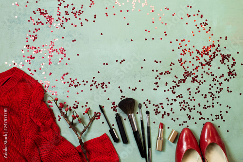 Top view to Valentines day party outfit simple red shoes