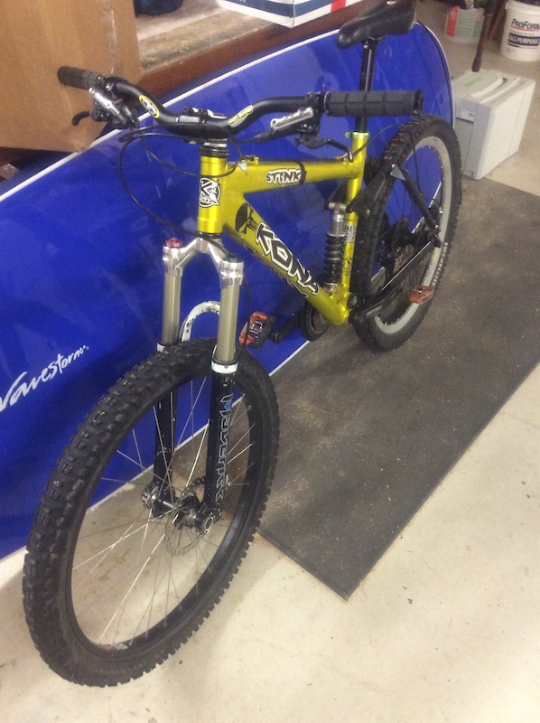 GREEN AND YELLOW KONA STINKY FIVE 8 SPEED FULL SUSPENSION MOUNTAIN BIKE WITH FRONT AND REAR DISC kona stinky five