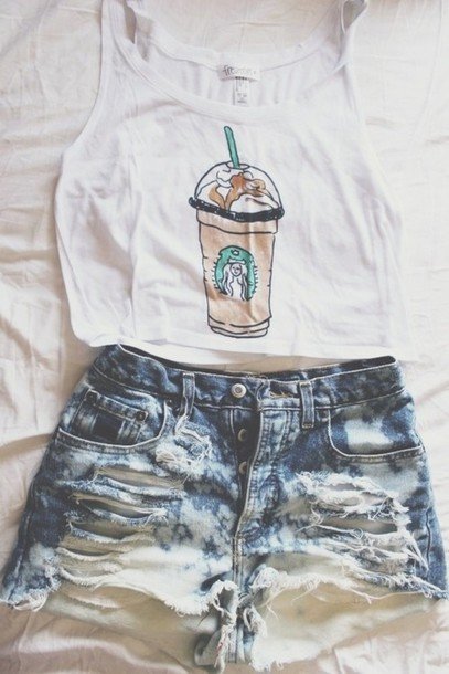 white top, denim shorts, ripped shorts cute ripped shorts