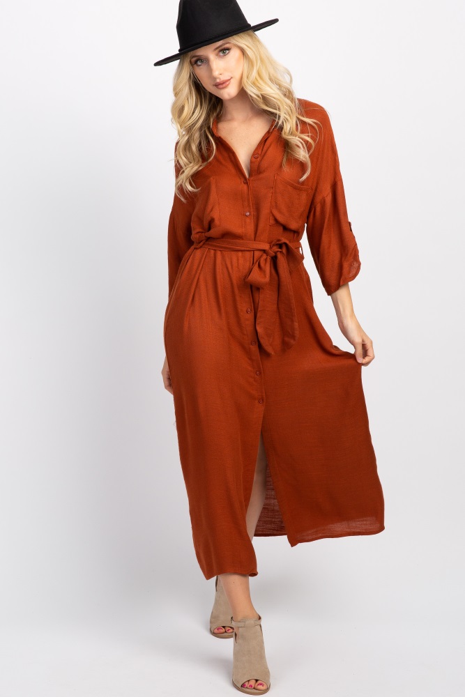 Rust Collared Button Down Midi Dress rust button down dress