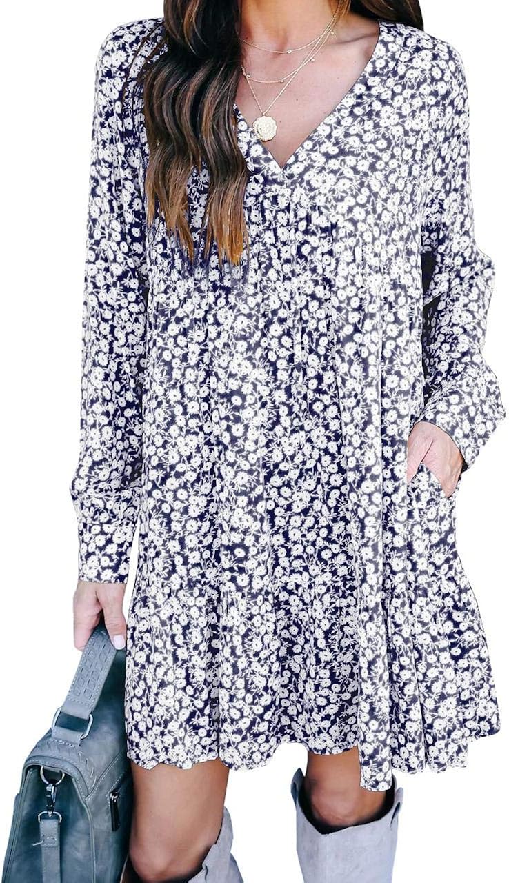 Womens Casual V Neck Long Sleeve Dress long summer shift dresses
