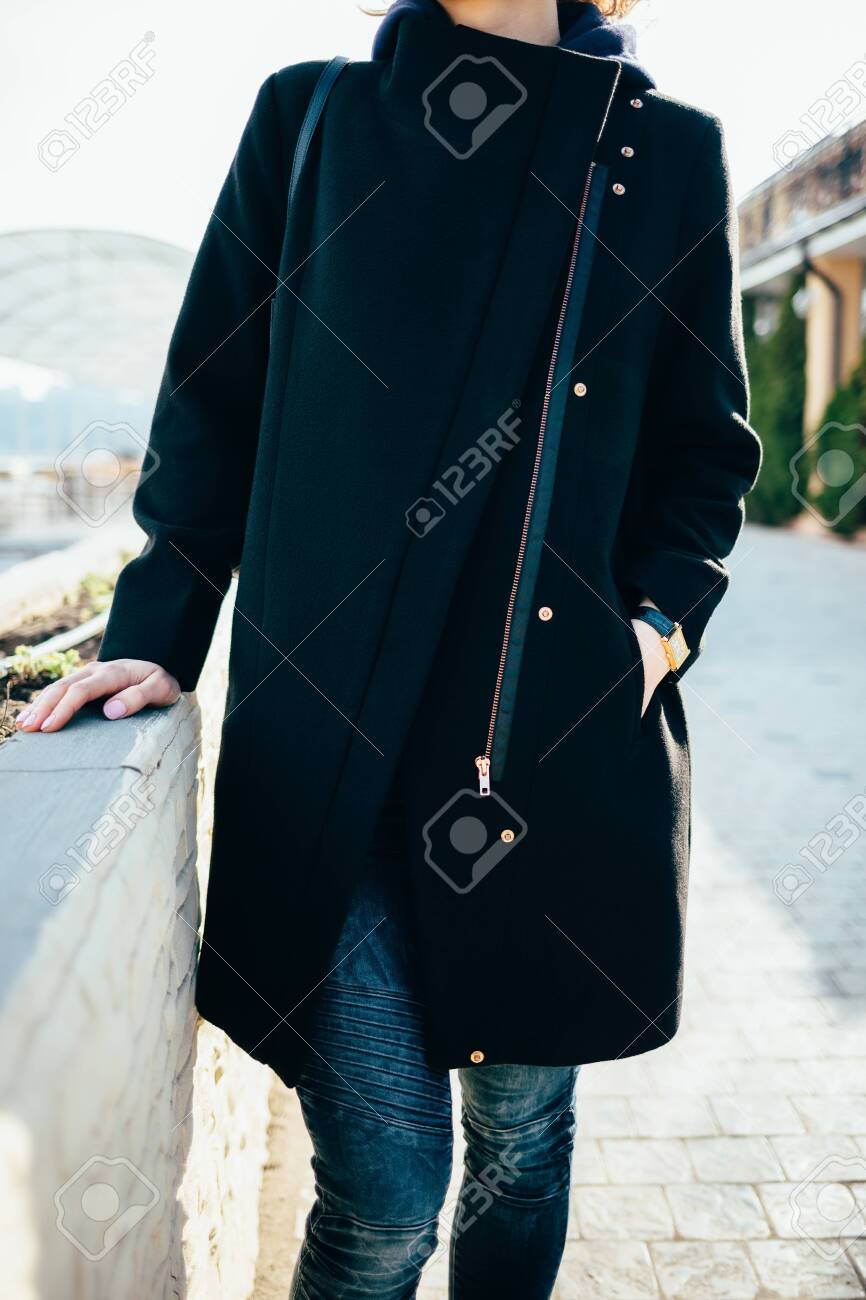 Young Woman Wearing Dark Blue Jeans black coat and blue jeans