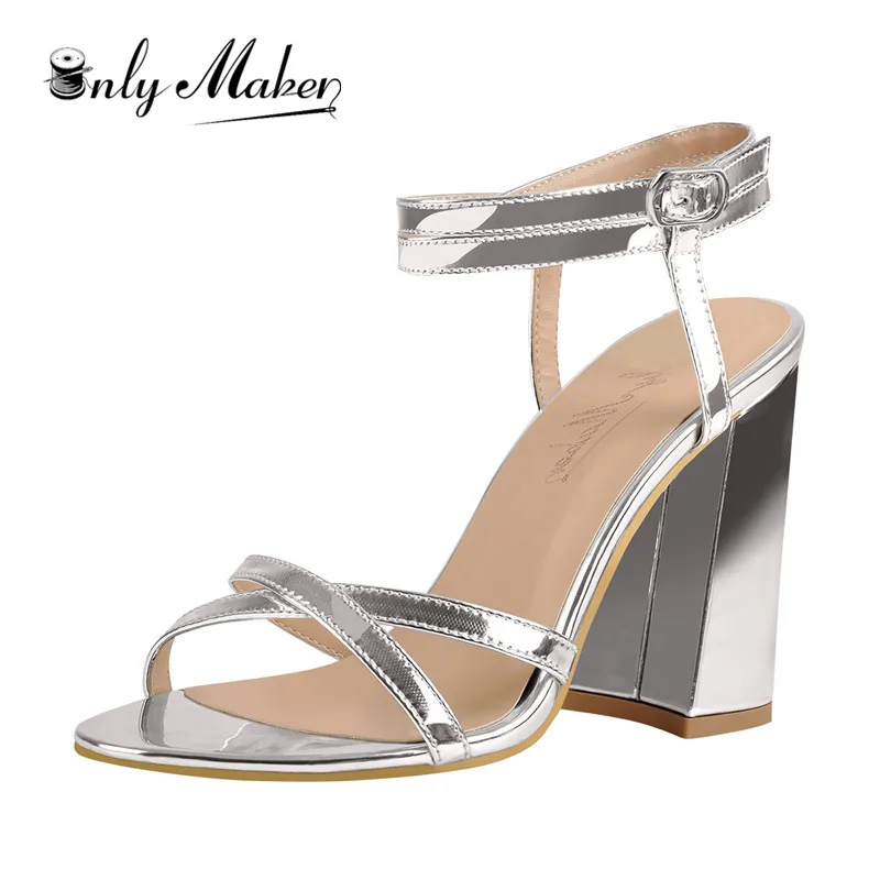 Women Sandals Summer Open Toe shiny silver strappy block heels