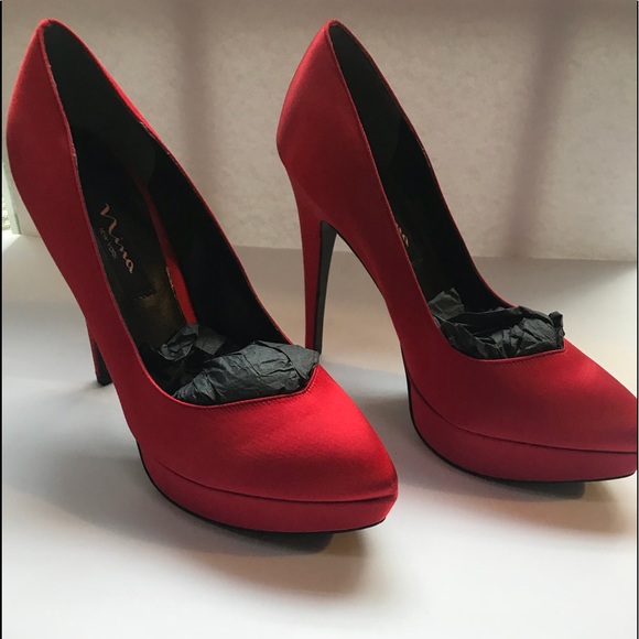 red satin platform heels